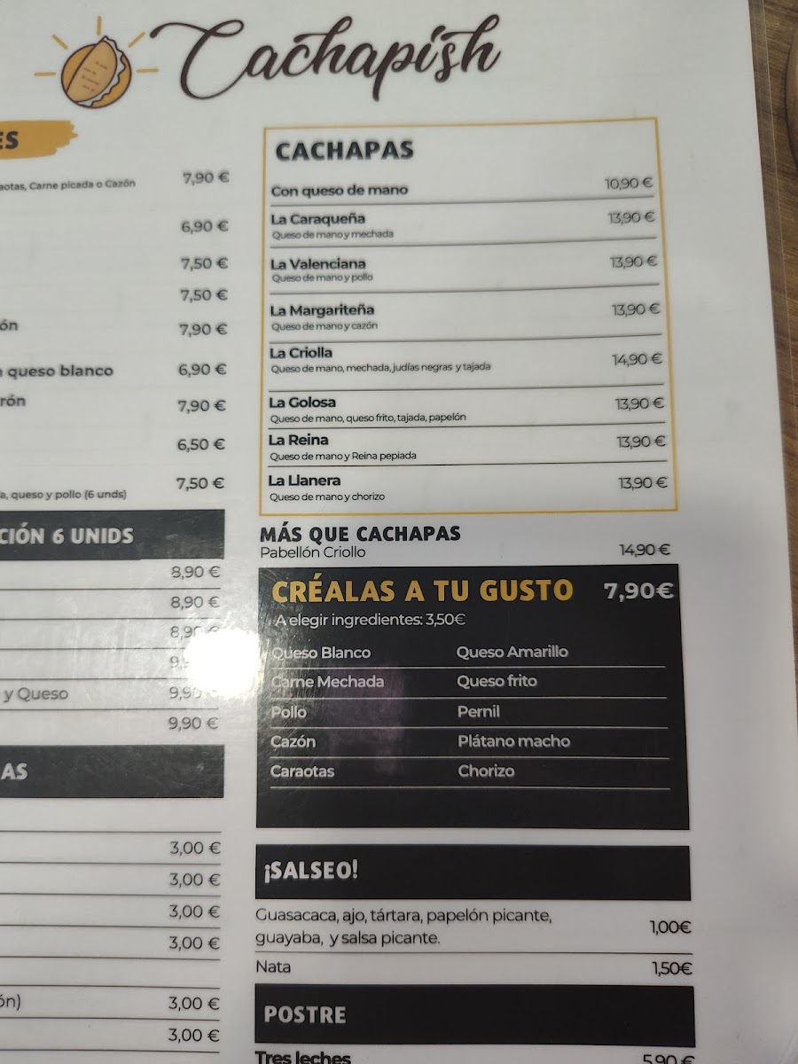 The menu also features a selection of refreshing zumos, such as Zumo De Maracuyá and Zumo De Guanábana, each for €4. Moreover, desserts like the Churros with dipping syrup and the decadent Tarta Tres Leches provide a sweet finish to your meal.